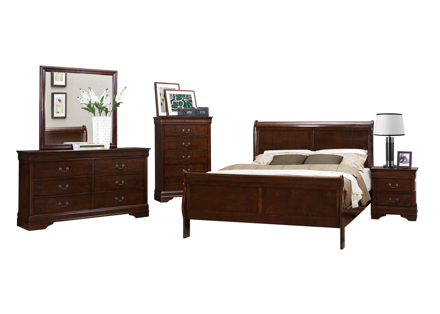 The Manburg Louis Philippe 5PC Bedroom Set Queen Bed, Dresser, Mirror, Nightstand, Chest in Burnish Cherry. Traditional in design and modest in scale, the elegant Mayville Collection takes its design inspiration from the classic Louis Philippe styling. Featuring four distinct finishes ��������� burnished brown cherry, white, black, and the newly offered stained grey ��������� with all of the traditional flare unique to the style ��������� antiqued metal bale hardware and distinct framing ��������� this collection is a perfect addition to your traditional adult or youth bedroom.