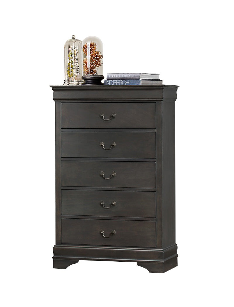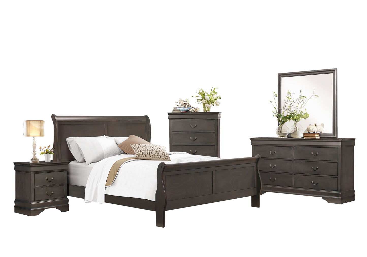 The Manburg Louis Philippe 5PC Bedroom Set Queen Sleigh Bed, Dresser, Mirror, Nightstand, Chest in Dark Brown Finish. Traditional in design and modest in scale, the elegant Mayville Collection takes its design inspiration from the classic Louis Philippe styling. Featuring four distinct finishes ��������� burnished brown cherry, white, black, and the newly offered stained grey ��������� with all of the traditional flare unique to the style ��������� antiqued metal bale hardware and distinct framing ��������� this collection is a perfect addition to your traditional adult or youth bedroom.