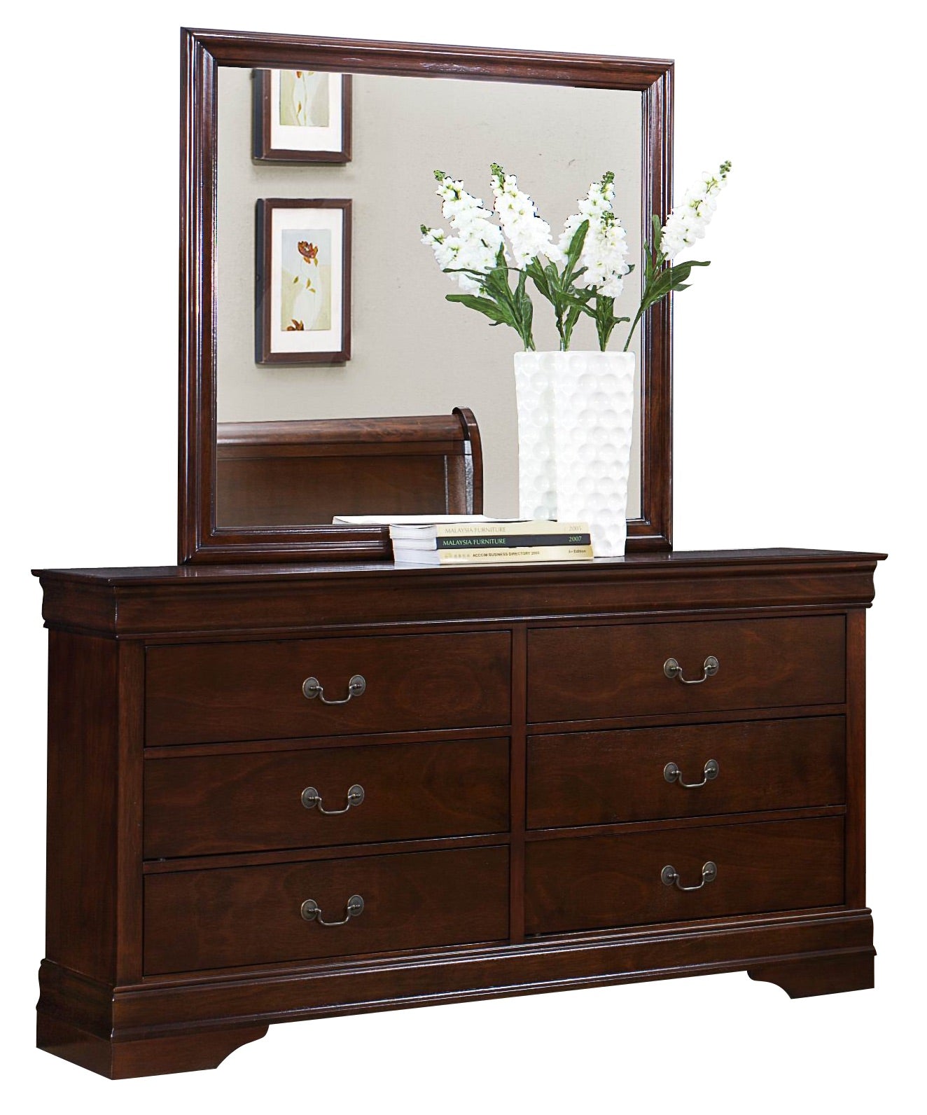 The Manburg Louis Philippe Dresser Mirror in Burnish Cherry. Traditional in design and modest in scale, the elegant Mayville Collection takes its design inspiration from the classic Louis Philippe styling. Featuring four distinct finishes � burnished brown cherry, white, black, and the newly offered stained grey � with all of the traditional flare unique to the style � antiqued metal bale hardware and distinct framing � this collection is a perfect addition to your traditional adult or youth bedroom.