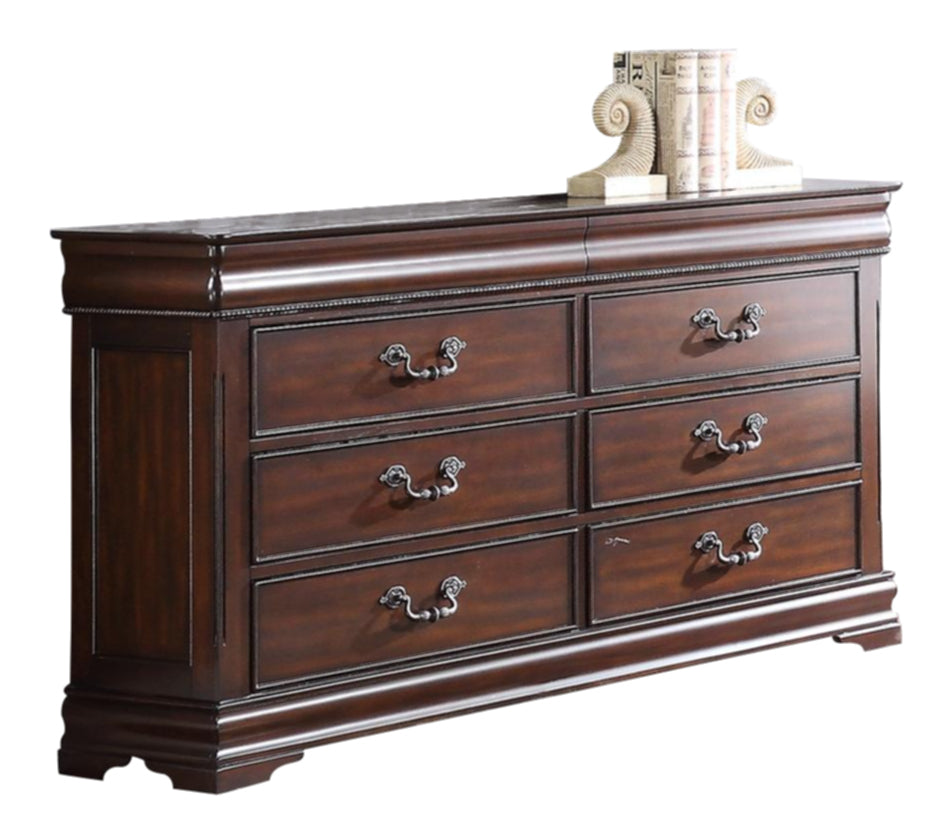 The Homelegance Mont Belvieu Dresser in Cherry. When looking to furnish your traditional home, you choose pieces that are timeless. The classic look of the cherry finished French Country Collection will allow you to fulfill your design desire. Pairing the panel bed of the collection with the traditional look of Louis Philippe styling, instantly creates a classic look to your bedroom. Carved finials and squared pilasters provide traditional accent to the bed as does the shell and scroll motif of the headboard and footboard that carries over to the collection�s mirror.