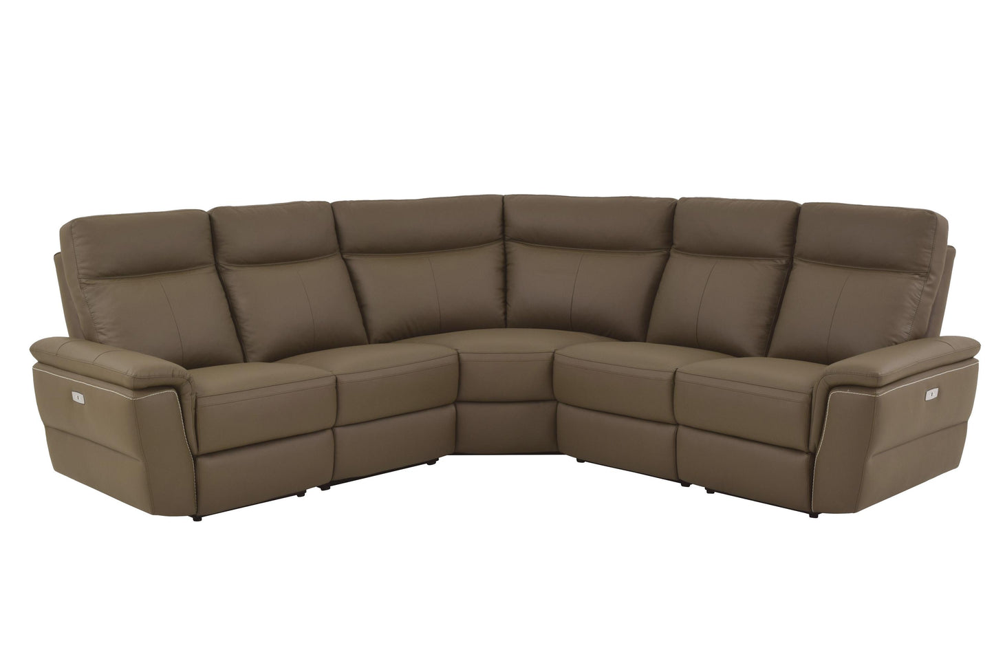 The Homelegance Olympia 5PC Sectional Power Left Side Reclining Chair, Two Armless Chair, Corner Seat & Power Right Side Reclining Chair in Brown Top Grain Leather Taupe. There is no mistaking the Homelegance Olympia Collection for anything but a bold study on contemporary design. Sleek lines extend with the push of a button on taking you from a seated to prone position with amazing ease, with the sectional book-ended by right and left chaise options or USB port enhanced end power one-arm recliner. The Brown Taupe tone top grain Top Grain Leather covers the seats, top part of the arms and front part of the backs, while leather match covers those areas beyond your initial reach. White contrast stitching further accents the design. The collection is available in several different configurations to choose from to complete your seating arrangement.