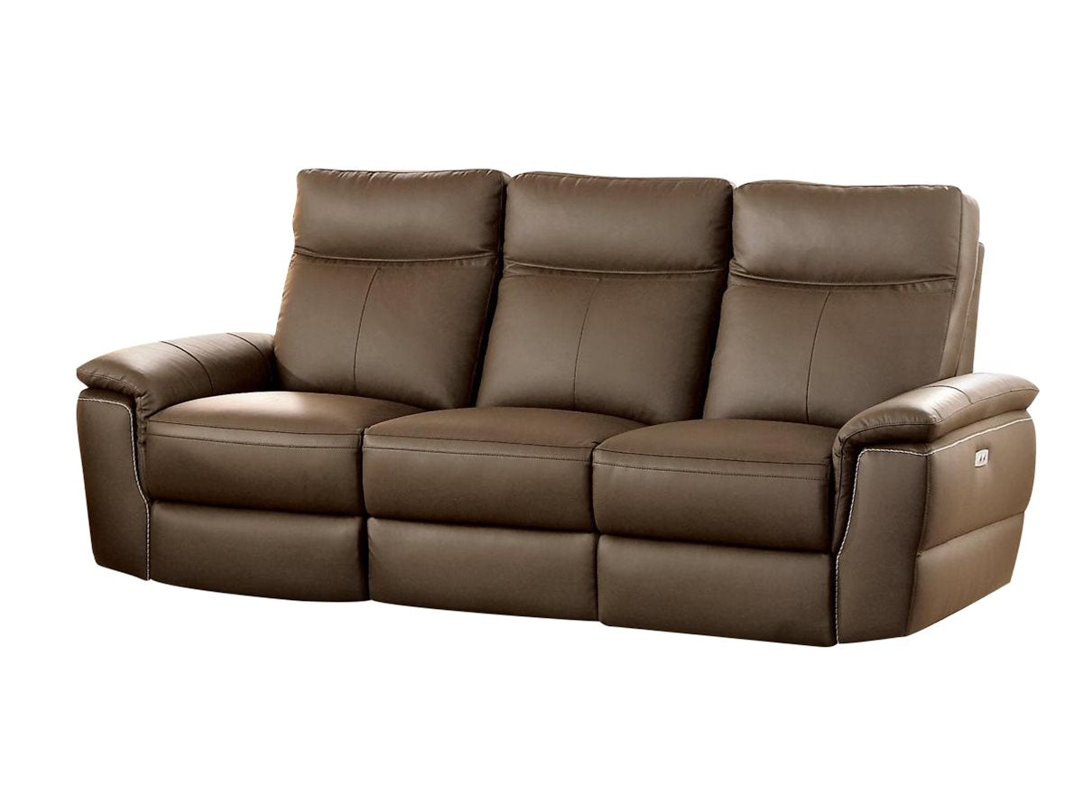 The Homelegance Olympia Power Double Reclining Sofa in Top Grain Leather - Raisin. There is no mistaking the Olympia Collection for anything but a bold study on contemporary design. Sleek lines extend with the push of a button on taking you from a seated to prone position with amazing ease, whether you are on the dual reclining sofa, dual reclining love seat, or reclining chair. The raisin tone top grain leather covers the seats, top part of the arms and front part of the backs, while leather match covers those areas beyond your initial reach. White contrast stitching further accents the design. The collection is available in several different configurations to choose from to complete your seating arrangement.