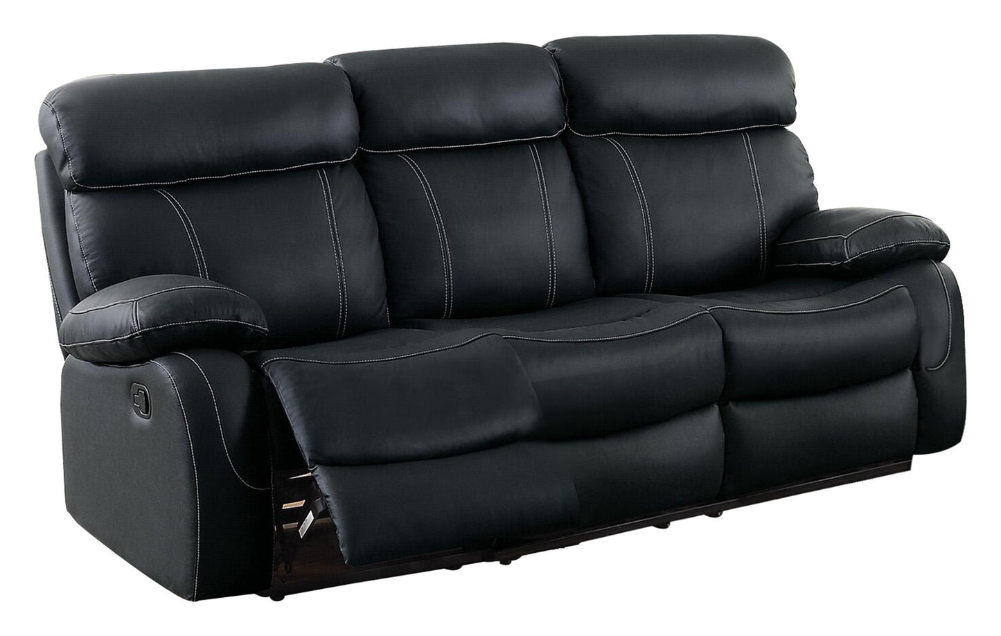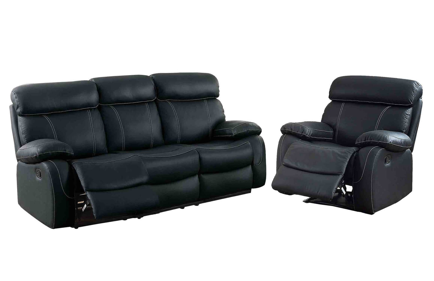 The Homelegance Pendu 2PC Double Reclining Sofa & Reclining Chair in Black Leather. Contoured for your ultimate comfort and designed for placement in homes with transitional or contemporary style, the Homelegance Pendu Collection will provide the relaxing platform you need for your downtime. Plush seating and backs extend from seated to prone with a pull of the manual reclining mechanism on each piece in the collection � dual reclining sofa, love seat and chair. The top and front bodies of each piece in the collection is covered in black or brown top grain leather, with leather match covering those areas beyond your initial reach.