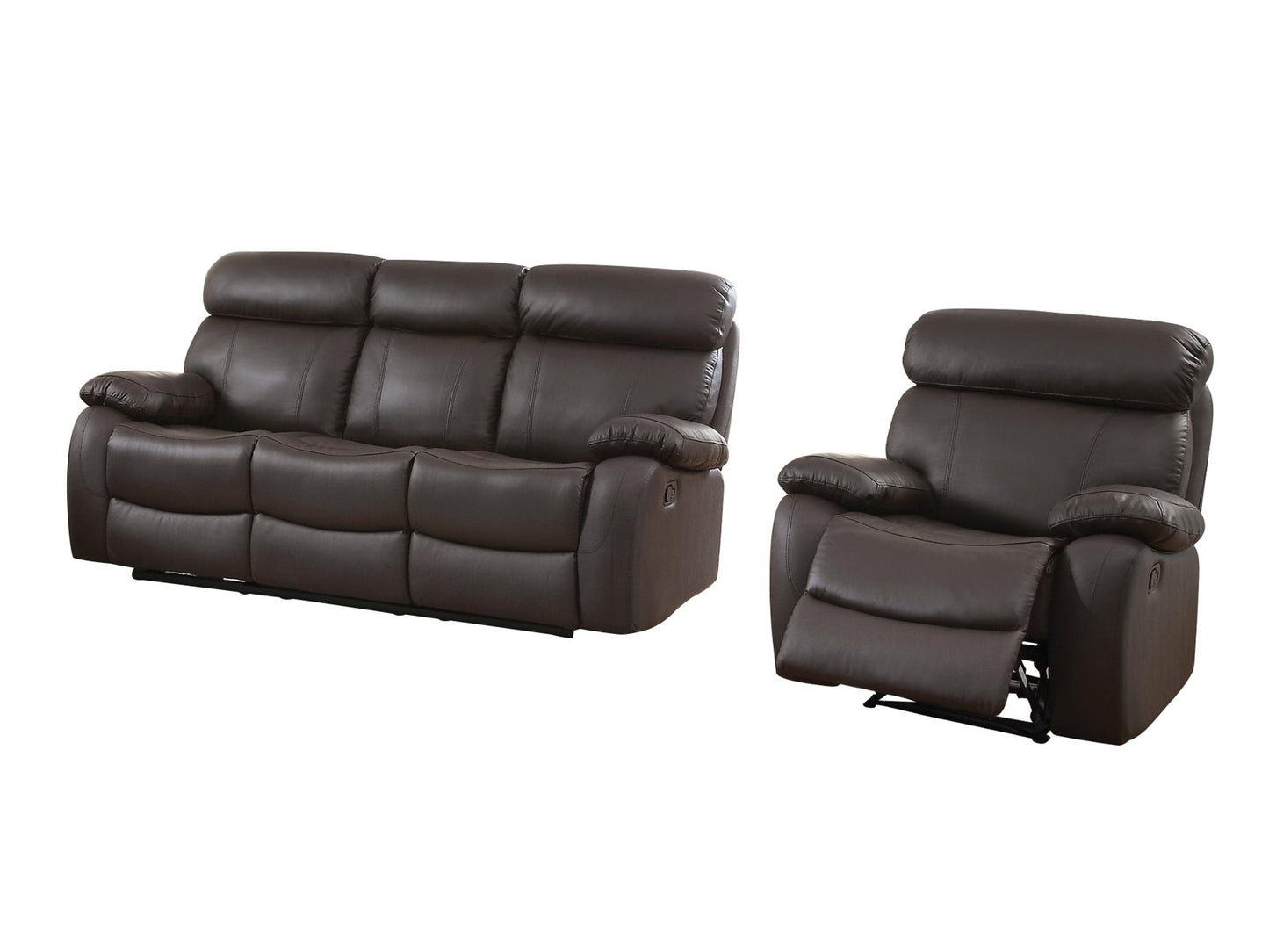 The Homelegance Pendu 2PC Double Reclining Sofa & Reclining Chair in Brown Leather. Contoured for your ultimate comfort and designed for placement in homes with transitional or contemporary style, the Homelegance Pendu Collection will provide the relaxing platform you need for your downtime. Plush seating and backs extend from seated to prone with a pull of the manual reclining mechanism on each piece in the collection � dual reclining sofa, love seat and chair. The top and front bodies of each piece in the collection is covered in black or brown top grain leather, with leather match covering those areas beyond your initial reach.