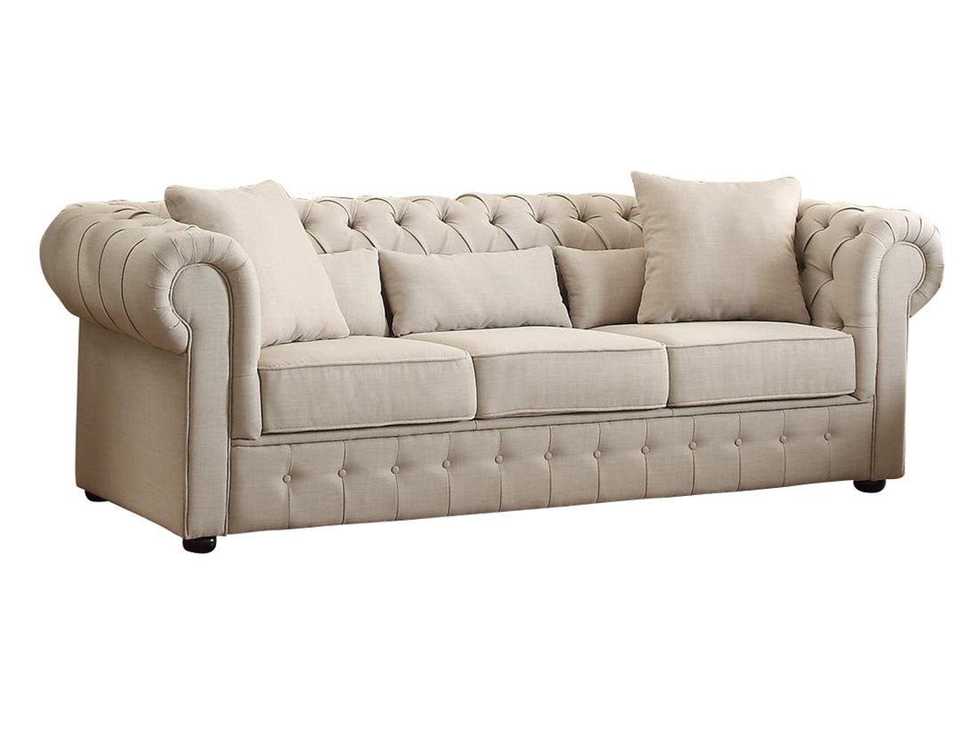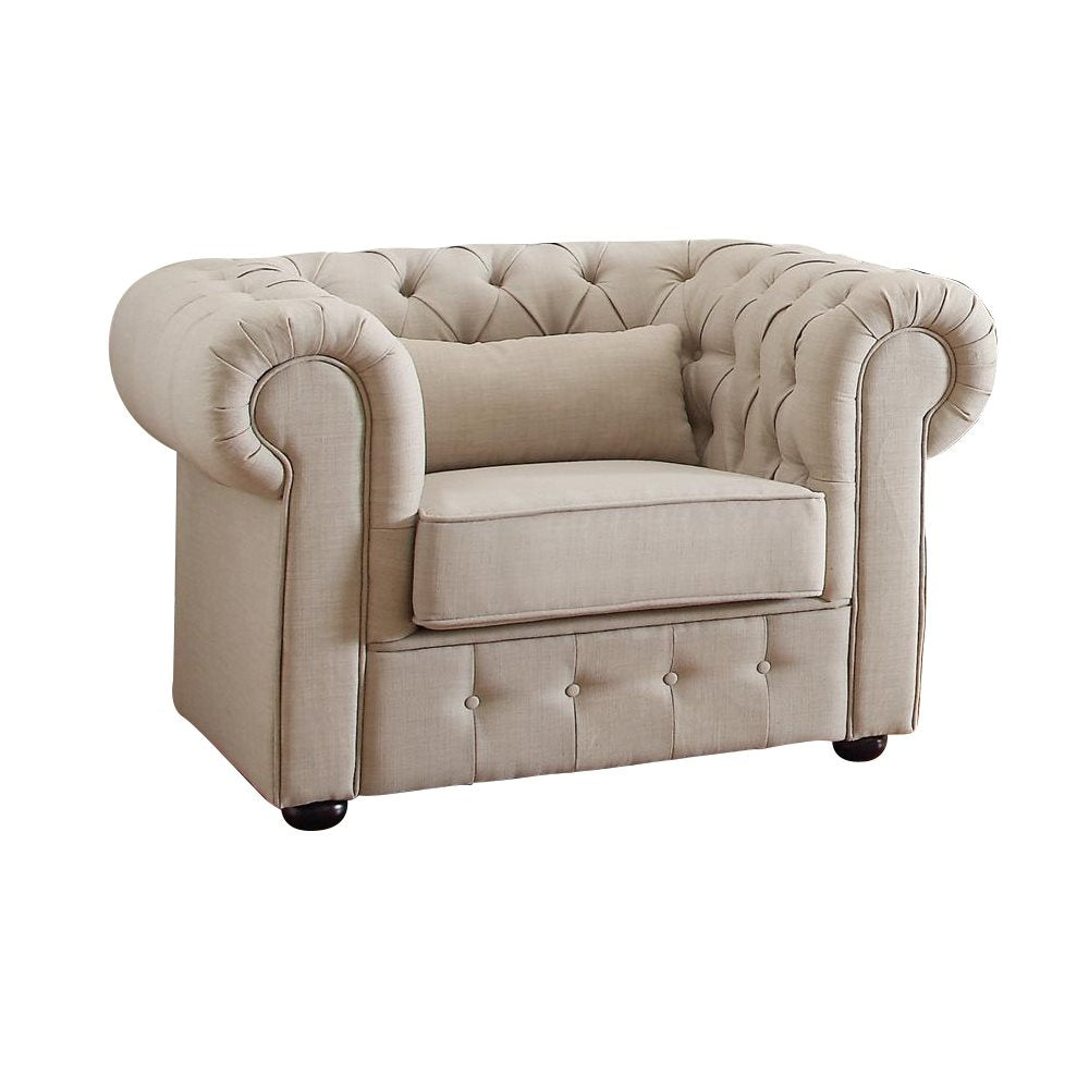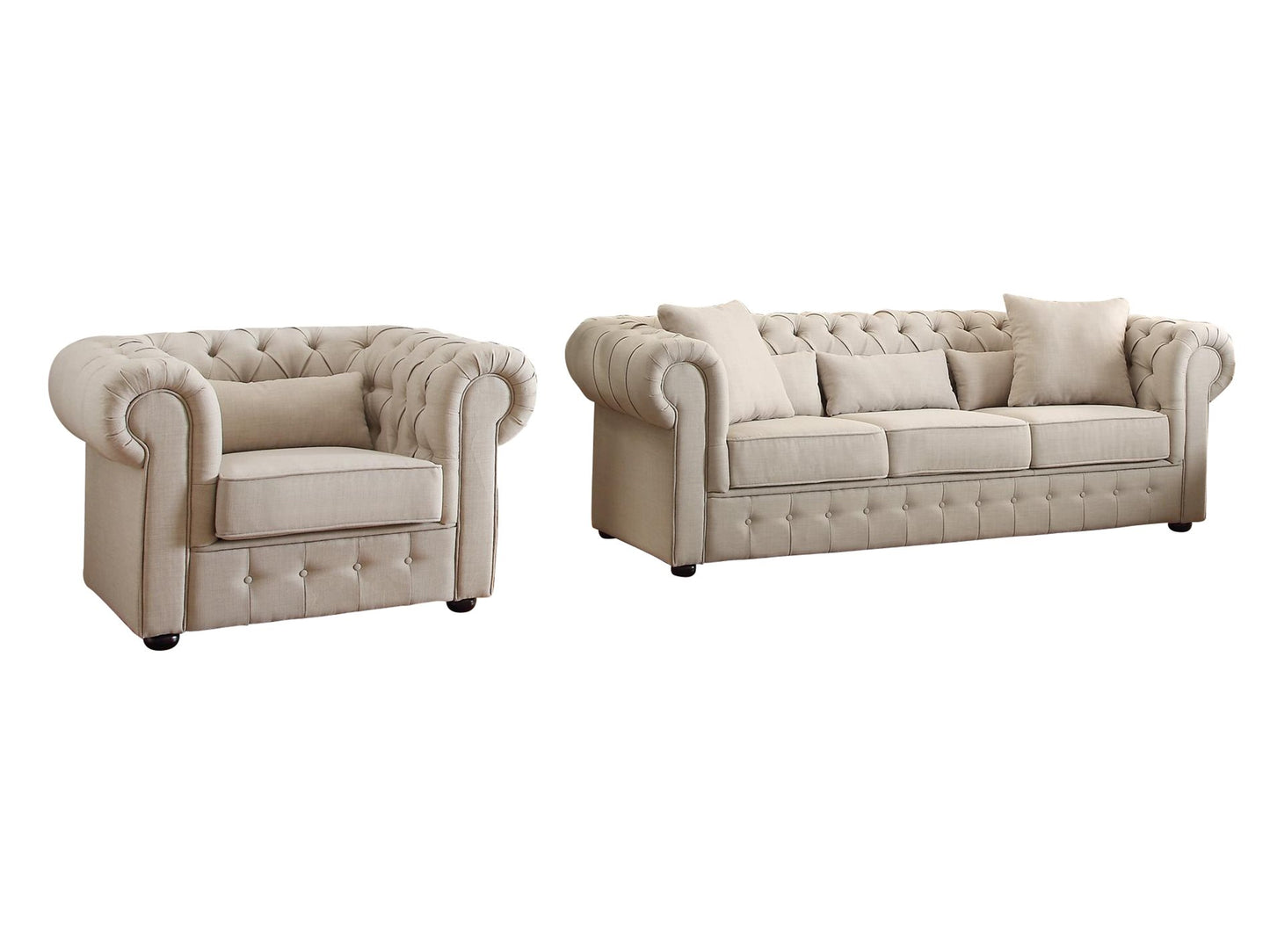 The Homelegance Savonburg Park 2PC Set Sofa & Chair in Natural Fabric. With a design that is driven by trend and style, the classic look of the Homelegance Savonburg Park Collection blends with a number of modern and traditional settings. This Chesterfield style seating group is offered in neutral tone fabric and features button tufting and a heavily rolled arm that transitions to encompass the entire back of each piece in the collection. The substantial size of this offering allows for maximum comfort that is enhanced by the accompanying toss pillows. Offered in both sectional and traditional seating styles.