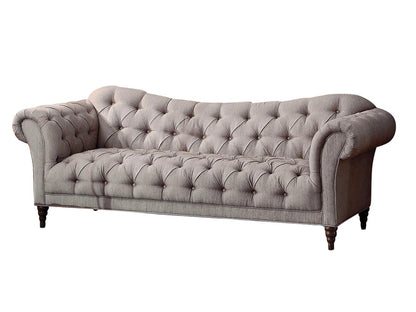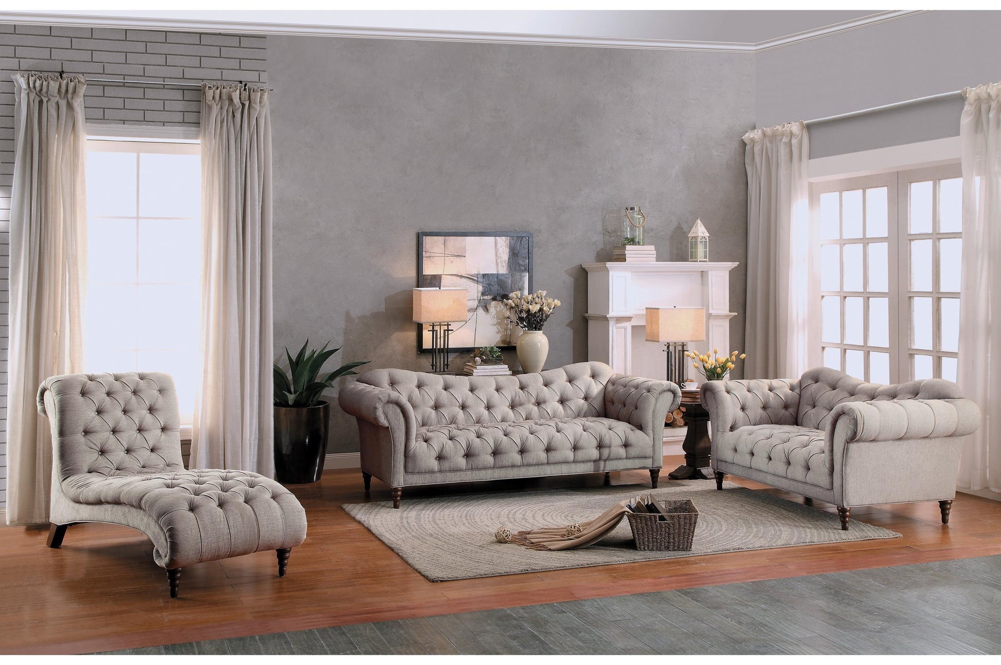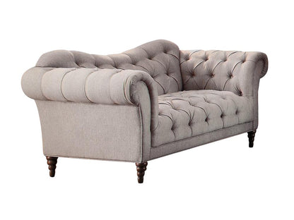 The Homelegance St. Claire Park 2PC Set Sofa & Love Seat in Neutral Beige Fabric. Graceful curves are elegantly appointed in the St. Claire Collection. Delicate herringbone style fabric presents as the initial look into the traditional style of this seating group with prevalent button-tufted accenting that is hard to overlook. The rolled arms and bowed seatbacks present an air of femininity while lending curvaceous inspiration to the traditional chaise lounge. Neutral Beige finished turn legs provide support and complement the brown tone of the fabric.