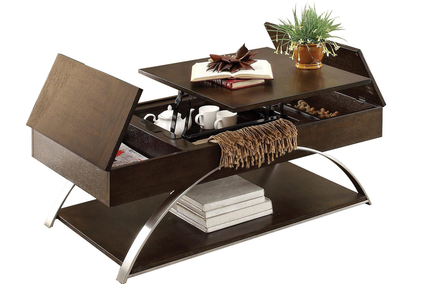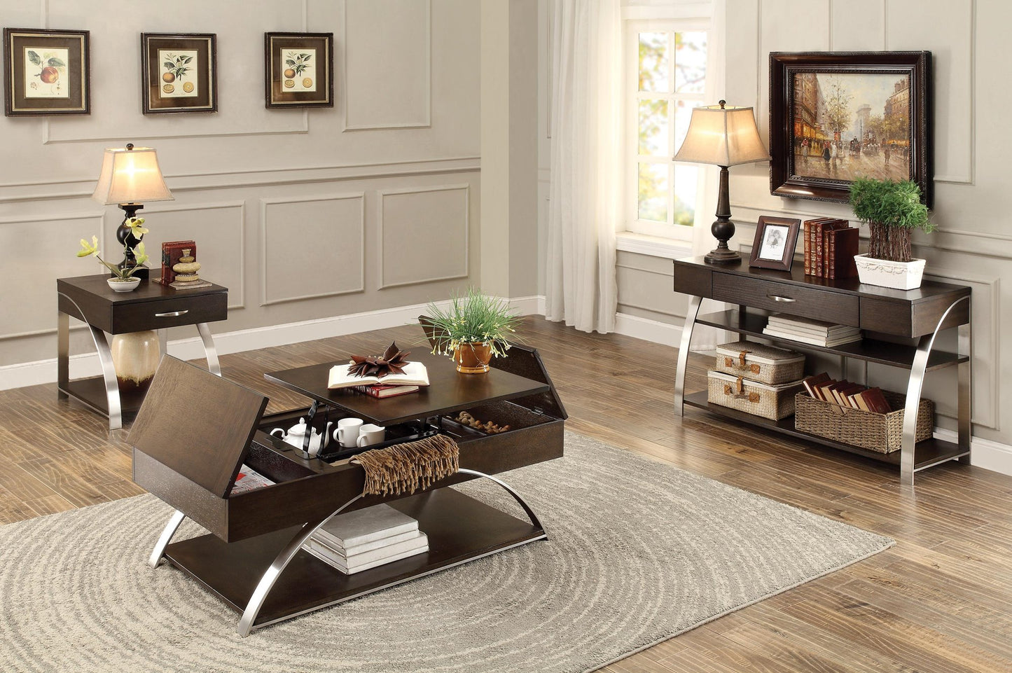 The Homelegance Tioga Cocktail Table with Lift Top and Storage in Espresso. Designed for the modern home, the Homelegance Tioga Collection will provide a unique look for your living room. Brushed chrome geometric support legs provide a distinct contrast to the espresso finish of the table tops and display shelves in this occasional grouping. Drawers provide additional storage space while the functionality of the collection is further enhanced by the lift mechanism that allows for the extension of the cocktail table�s top.