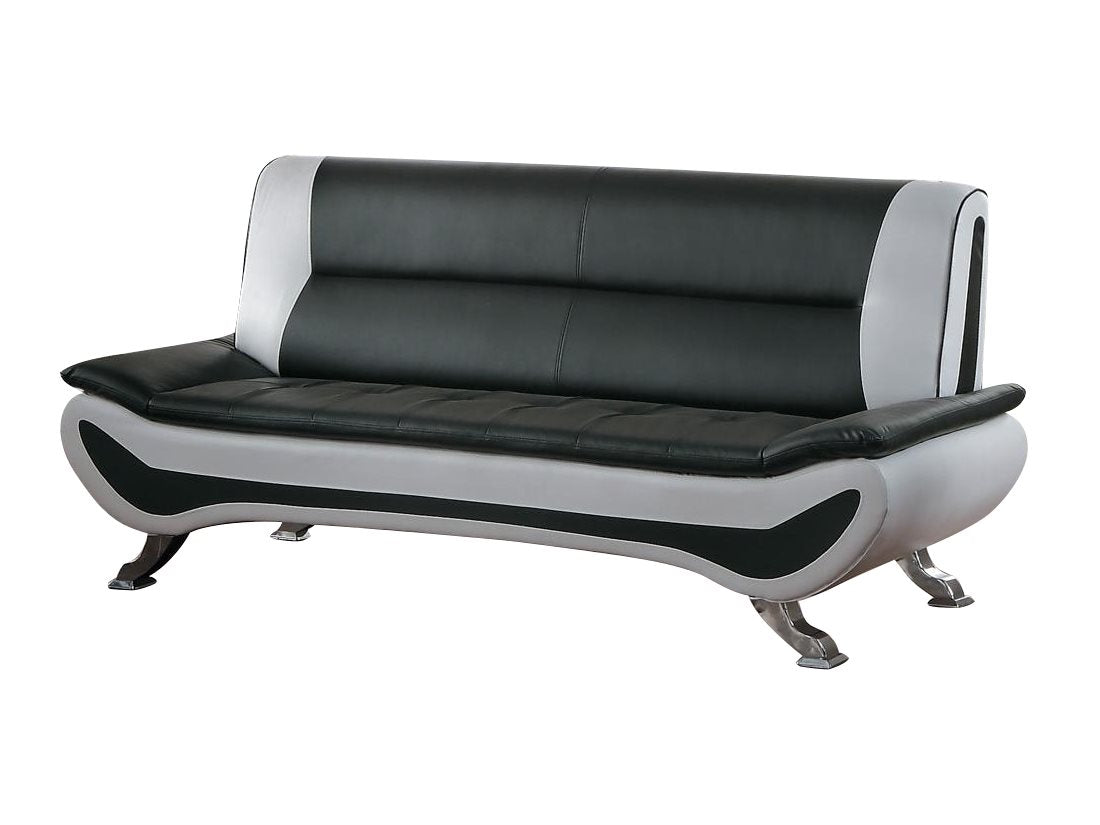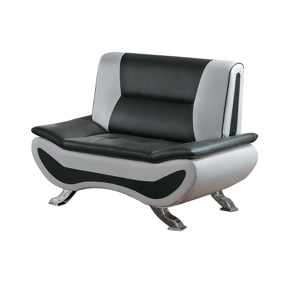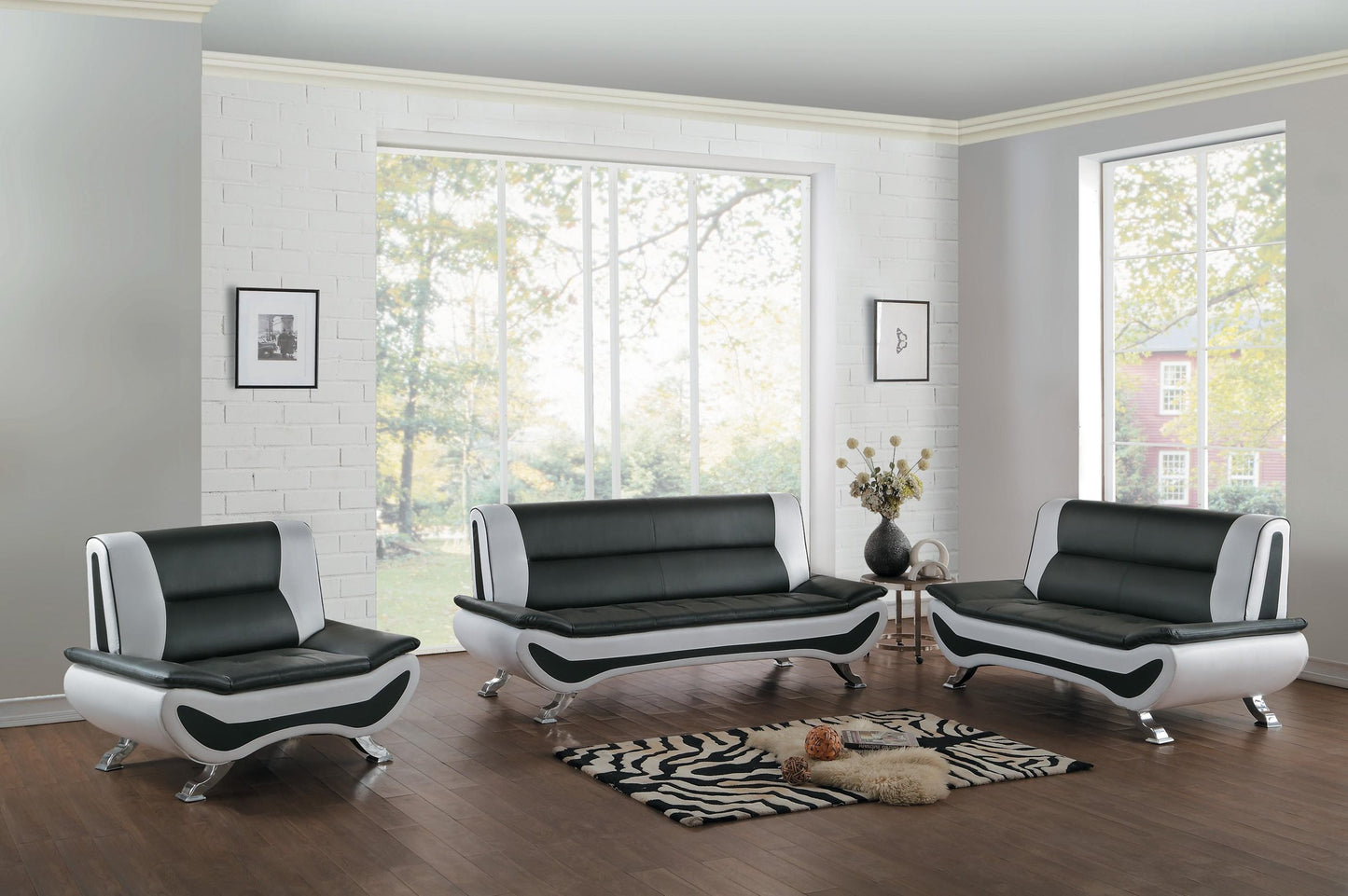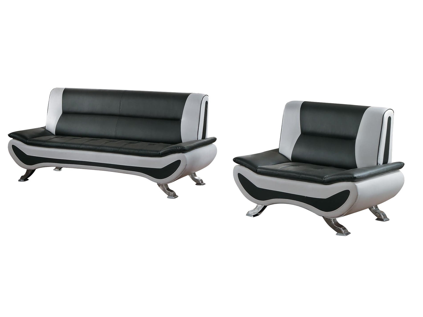 The Homelegance Veloce Park 2PC Sofa & Chair in Black Leather & White. Bringing to mind the sleek styling of an Italian race car, bold contemporary styling creates eye-catching drama for your living room with the Veloce Collection. Color blocked black and ivory bi-cast vinyl covers the ultra-low profile seating and accompanying glass-topped cocktail table, while chrome legs provide support.