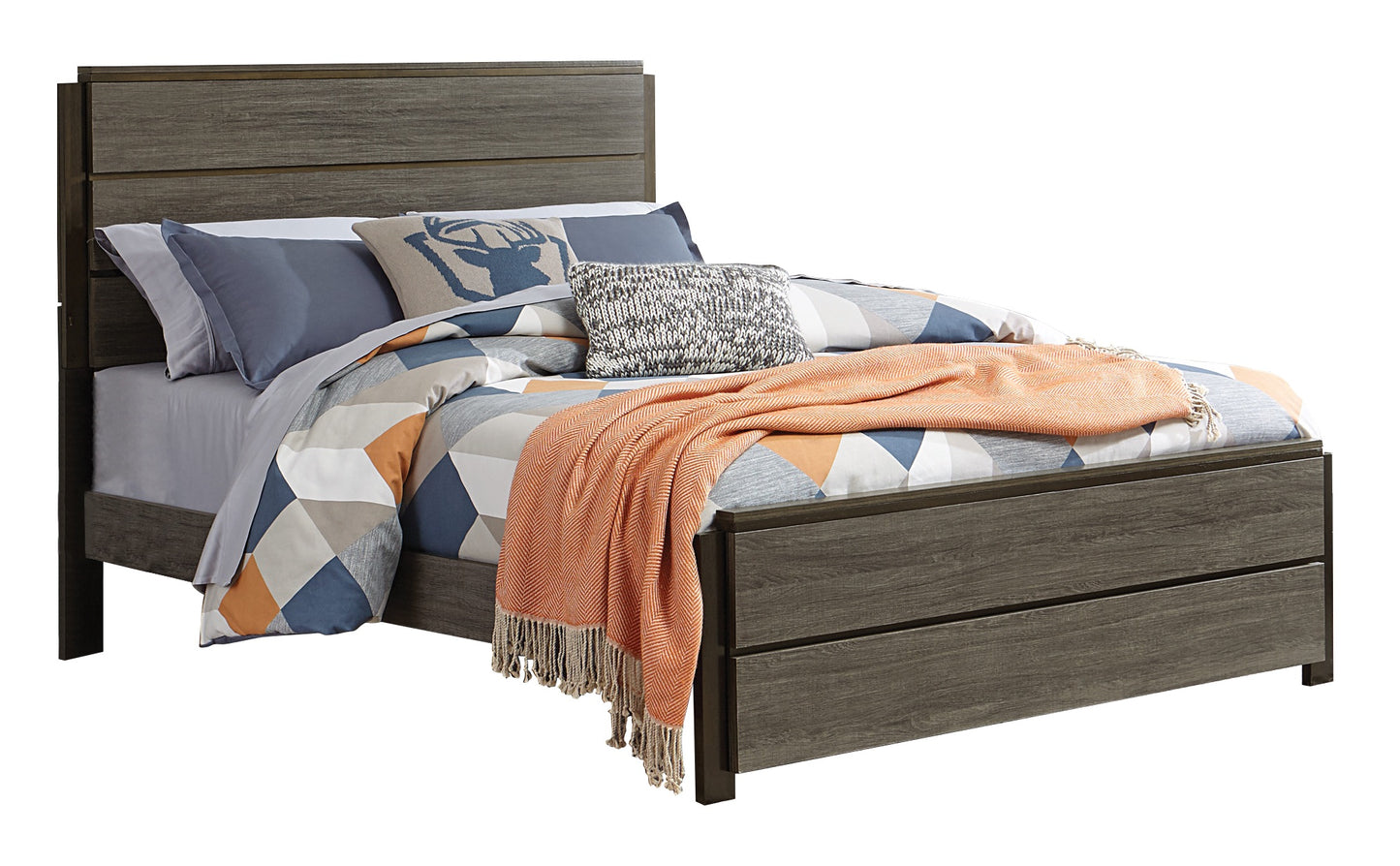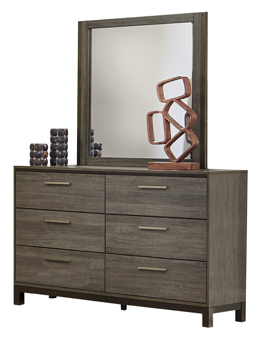 The Volos 5PC Bedroom Set Cal King Bed, Dresser, Mirror, 2 Nightstand in Mid Modern Grey. The contemporary styling of the Vestavia Collection provides a unique platform from which to redecorate your bedroom. Faux wood printed veneer provides subtle texture and a grey finish as perfect contrast to the dark brown finish of the base rails of the case pieces and back panels of the headboard and footboard. Clean lines lend to the angular modern look and are enhanced by the horizontal brushed nickel hardware. Offered in both adult and youth beds, this collection provides great flexibility to your rooms at home.