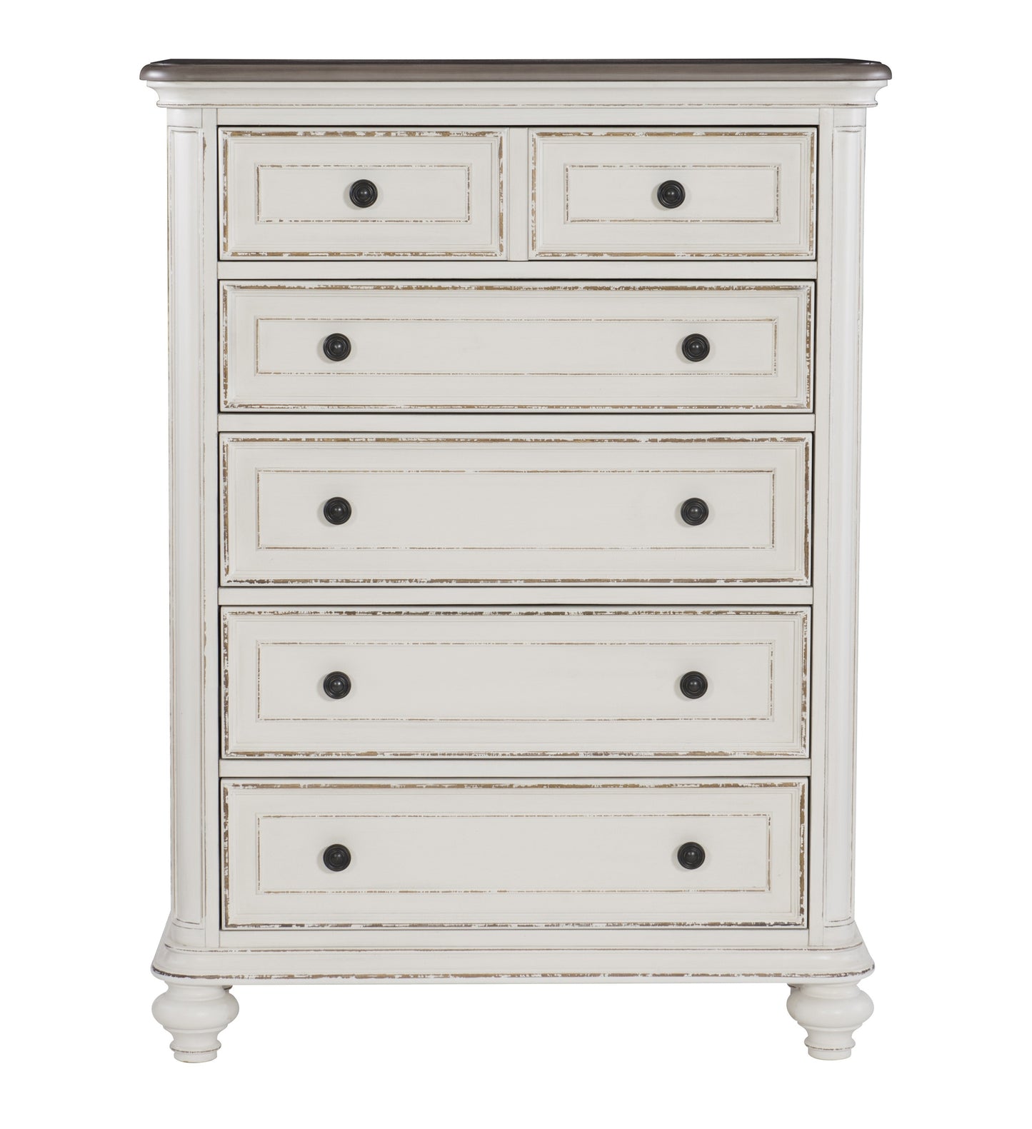 Soft, sweeping curves define the elegant profile of the Baylesford Collection. The chest is softened by an antique white rub-through finish with a brown-gray finished framed-plank top, creating a romantic aesthetic will place beautifully within your bedroom. Dark finished metal knob hardware provides complementing contrast to the drawer fronts.