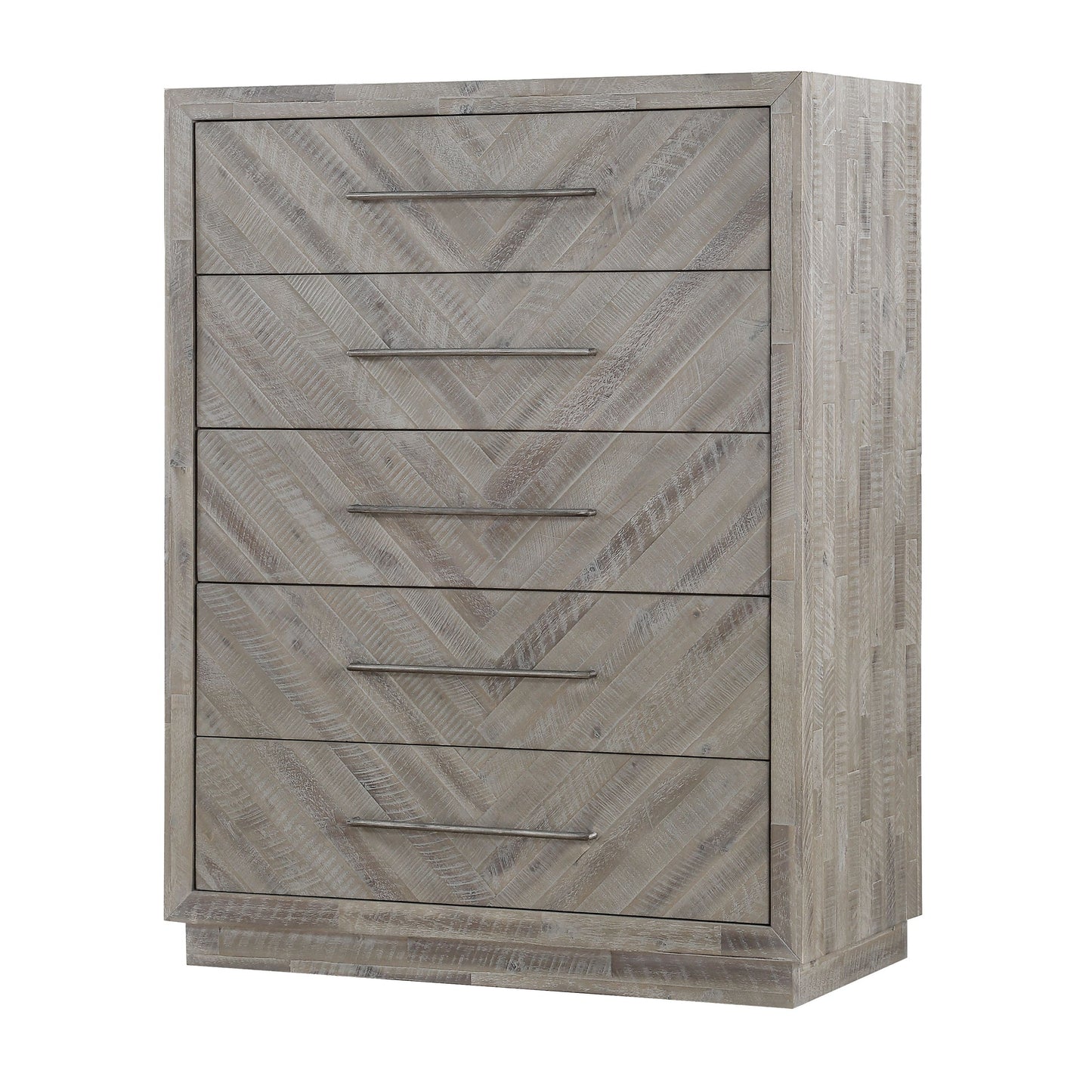 Rustic and contemporary. The Alexandra collection?s appeal comes from the roughhewn Acacia used in its creation. Hand-selected planks of solid wood are carefully sanded, stained and whitewashed for a driftwood appeal that accentuates the active grain and draws out natural knots and markings from the milling process. They are then inlaid over plywood to create a handsome herringbone pattern and finished with thin metal bar pulls for the crowning contemporary touch.