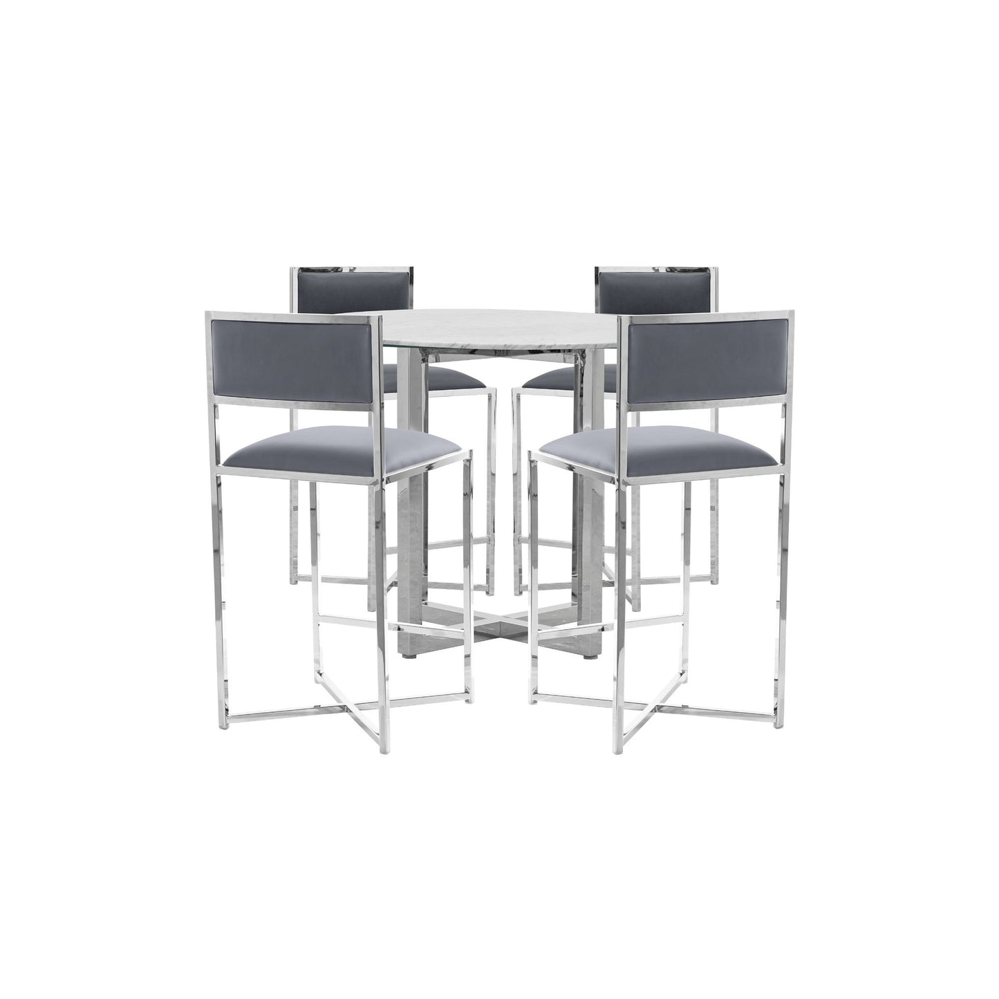 This Amalfi round counter height dining table features a marble tabletop and a chrome-plated stainless steel base. It will be a functional and stylish addition to a dining area.