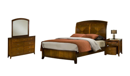 The Modus Brighton 4PC E King Bed Dresser Mirror One Nightstand Bedroom Set In Cinnamon. The Brighton collection is expertly crafted from Tropical Mahogany solids and Cherry Veneers and features a refined American finish in a deep, vibrant Cinnamon. When combined with the Brighton wood and sleigh beds, this collection will fill your bedroom with understated splendor and luxury.