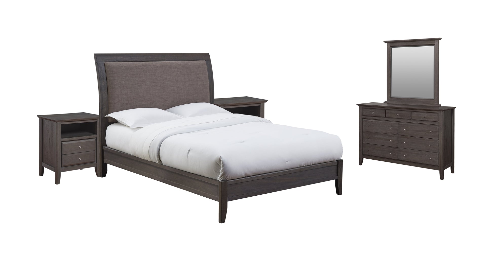 The Modus City II 5PC Cal King Bed Dresser Mirror Two Nightstand Bedroom Set In Dolphin. Featuring an all-new Basalt Grey finish and Dolphin linen upholstery, the City II collection is a timeless classic that emphasizes authentic livability. Built from Mahogany solid wood and veneer, signature features include beveled solid wood drawer fronts, floating tops, gently sleighed, padded headboards, and shallow top drawers for storing delicate items.