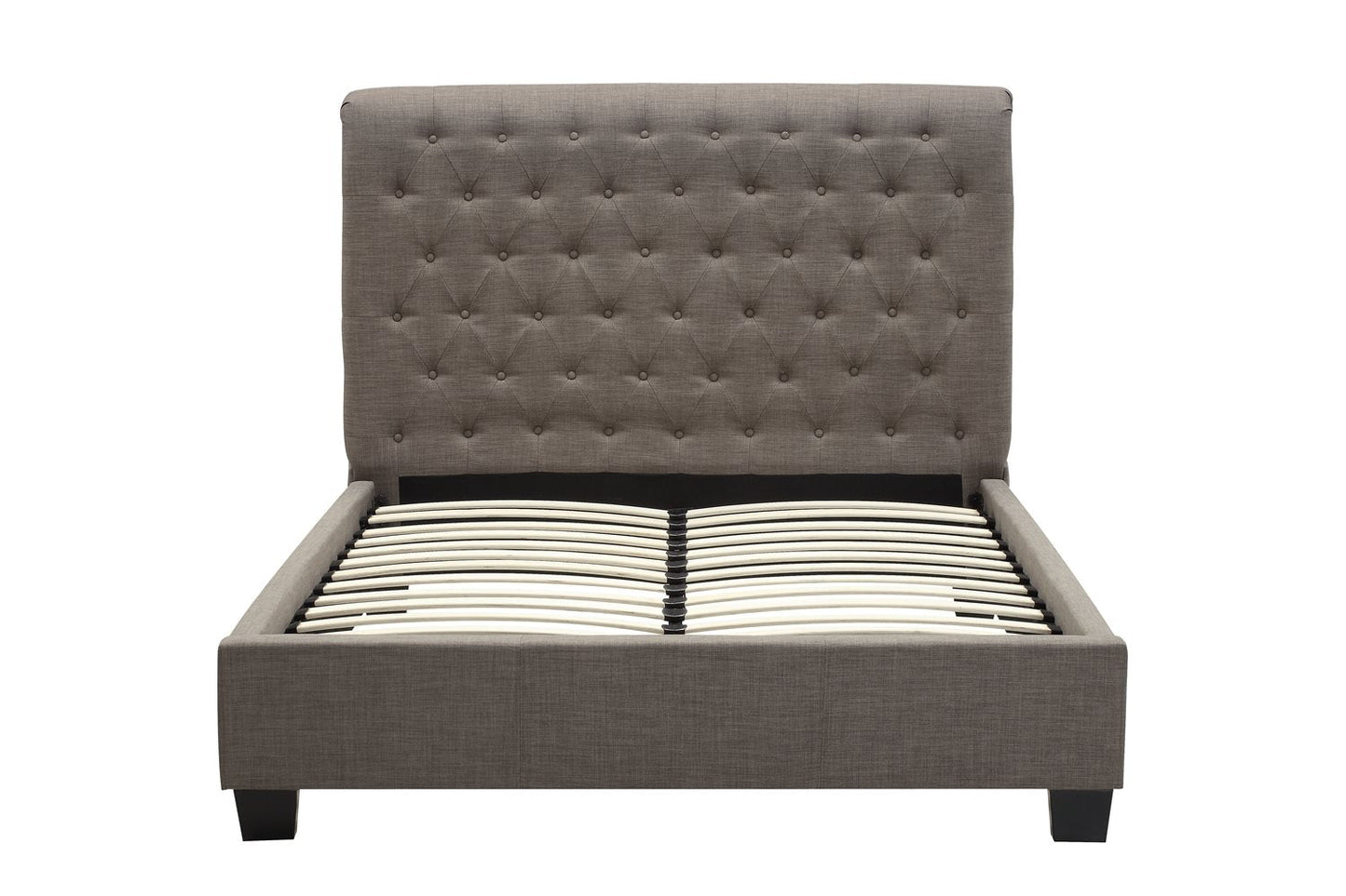 The Modus Geneva Cal King Royal Platform Bed In Dolphin. Indulgent tufting and cushioning surround you in luxury with the Geneva upholstered bed collection from Modus Furniture. Available as headboards or complete beds, each model is wrapped from head to toe in a textural linen fabric for a tailored finish. With styles ranging from sleek and modern to lavishly hand tufted, this collection features hand-hammered nails, high arching curves and piped edges that highlight each angle and shape.