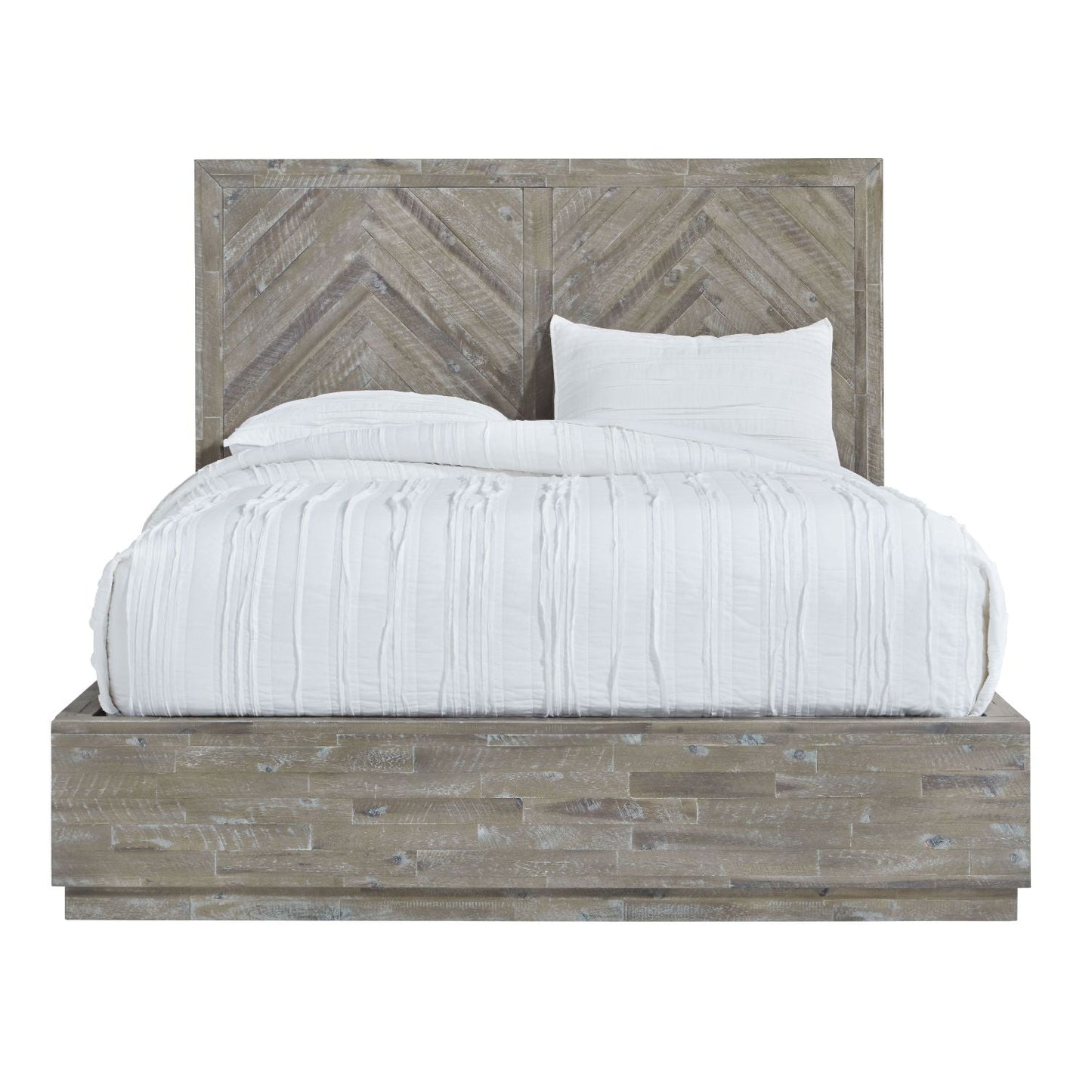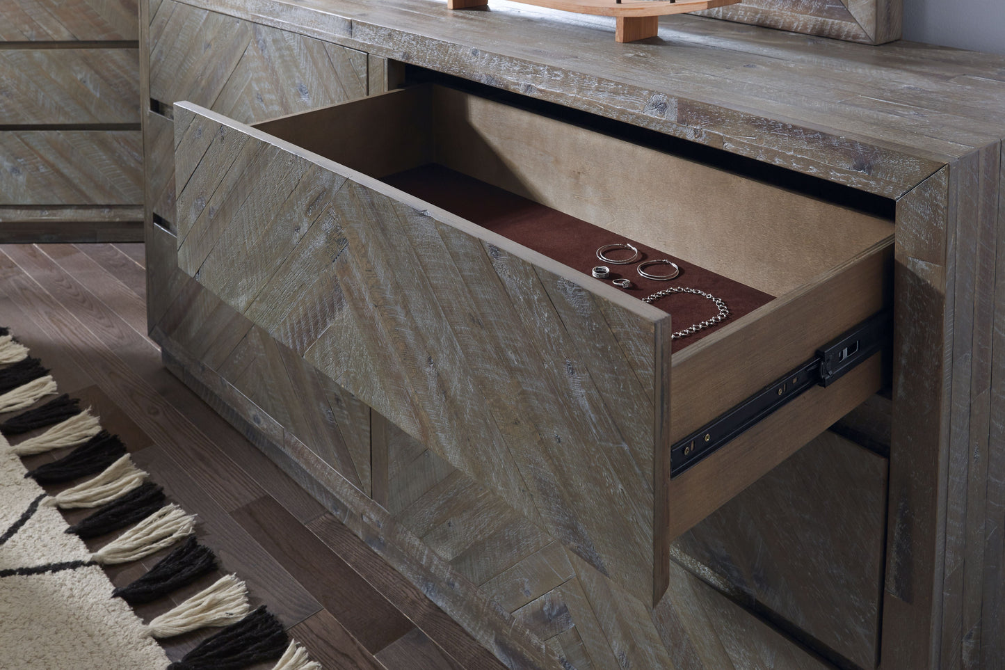 The Herringbone collection?s appeal comes from the beautifully roughhewn Acacia used in its creation. Hand-selected planks of solid wood are carefully sanded, stained and whitewashed for a driftwood appearance that accentuates the active grain and draws out natural knots and markings from the milling process. They are then inlaid over plywood to create a handsome herringbone pattern.