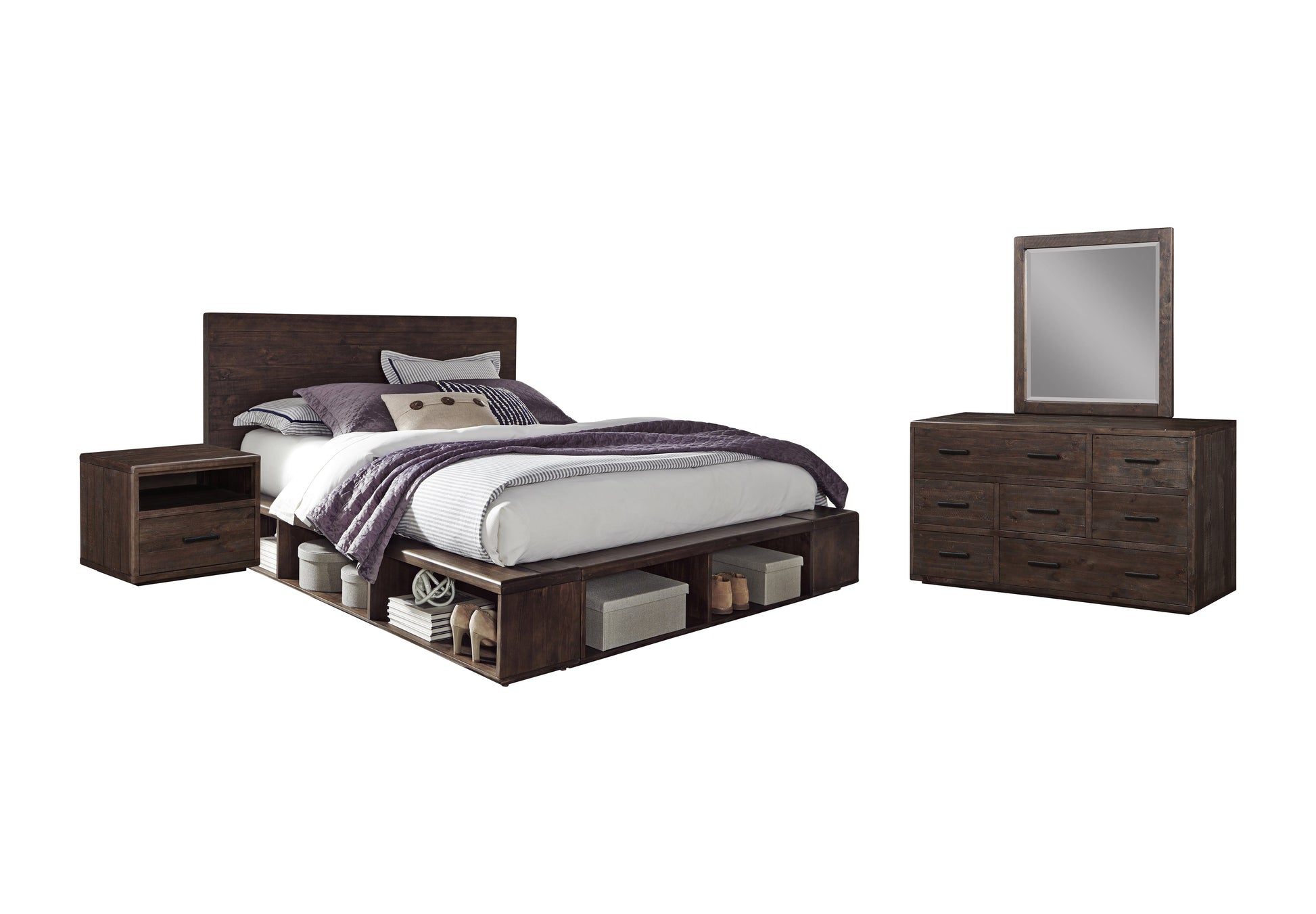 The Modus McKinney 4PC E King Platform Bed Dresser Mirror One Nightstand Bedroom Set In Espresso Pine. Made from solid wood in a rich Espresso Pine finish, naturally roughhewn surfaces are softened by unique bullnose edging, giving the McKinney collection its instinctive good looks. Asymmetrical dresser drawers and open storage in the nightstand and platform bed add versatility, while bar pulls sand-cast in a black iron finish complete the look.