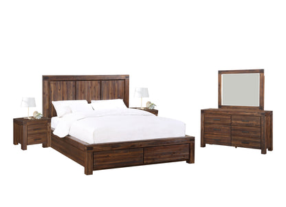 The Modus Meadow 5PC Cal King Platform Bed Dresser Mirror Two Nightstand Bedroom Set In Brick Brown. The Meadow collection is rugged durability and contemporary styling defined. Crafted from solid Acacia, its sleek lines showcase naturally occurring knot, grain and color variations inherent to the timber. Rustic wire brushing and a heavily glazed Brick Brown finish result in a perfect balance between modern and rustic.