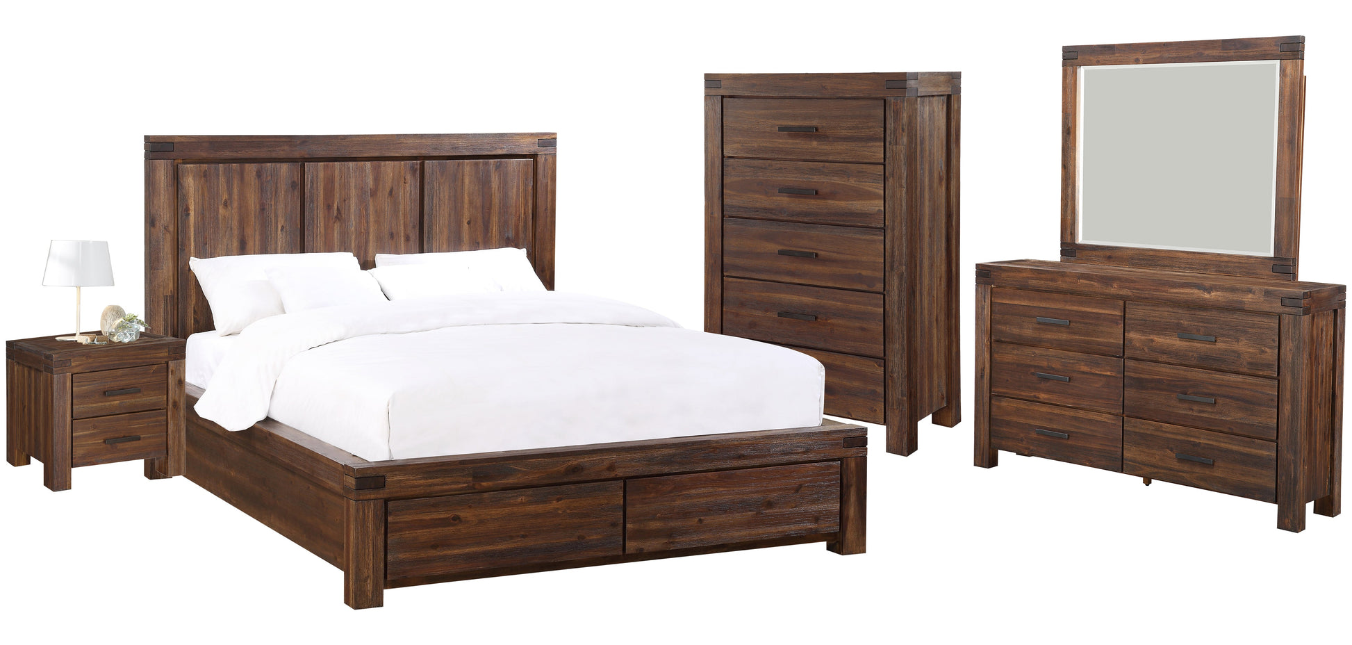 The Modus Meadow 5PC Cal King Storage Bed Dresser Mirror One Nightstand Chest Bedroom Set In Brick Brown. The Meadow collection is rugged durability and contemporary styling defined. Crafted from solid Acacia, its sleek lines showcase naturally occurring knot, grain and color variations inherent to the timber. Rustic wire brushing and a heavily glazed Brick Brown finish result in a perfect balance between modern and rustic.