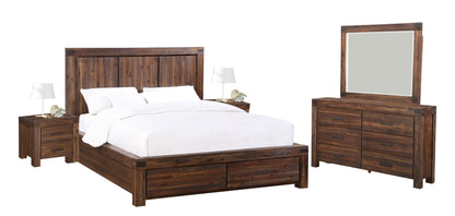 The Modus Meadow 5PC E King Storage Bed Dresser Mirror Two Nightstand Bedroom Set In Brick Brown. The Meadow collection is rugged durability and contemporary styling defined. Crafted from solid Acacia, its sleek lines showcase naturally occurring knot, grain and color variations inherent to the timber. Rustic wire brushing and a heavily glazed Brick Brown finish result in a perfect balance between modern and rustic.