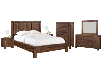 The Modus Meadow 6PC Cal King Platform Bed Dresser Mirror Two Nightstand Chest Bedroom Set In Brick Brown. The Meadow collection is rugged durability and contemporary styling defined. Crafted from solid Acacia, its sleek lines showcase naturally occurring knot, grain and color variations inherent to the timber. Rustic wire brushing and a heavily glazed Brick Brown finish result in a perfect balance between modern and rustic.