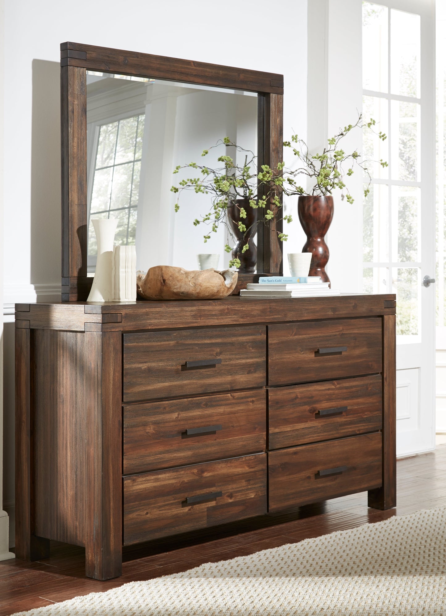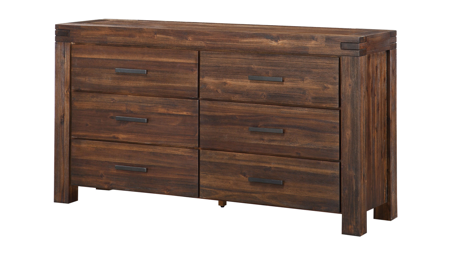 The Modus Meadow Dresser In Brick Brown. The Meadow collection is rugged durability and contemporary styling defined. Crafted from solid Acacia, its sleek lines showcase naturally occurring knot, grain and color variations inherent to the timber. Rustic wire brushing and a heavily glazed Brick Brown finish result in a perfect balance between modern and rustic.