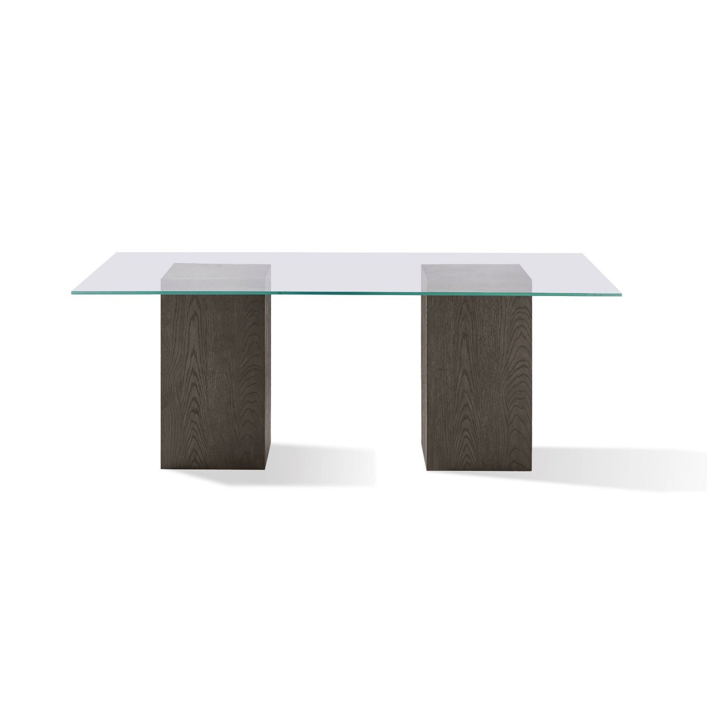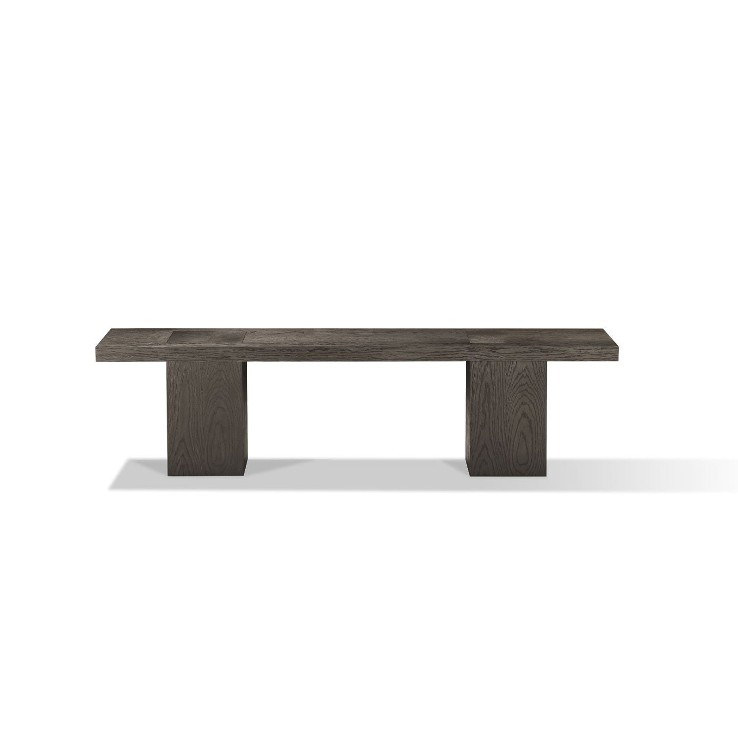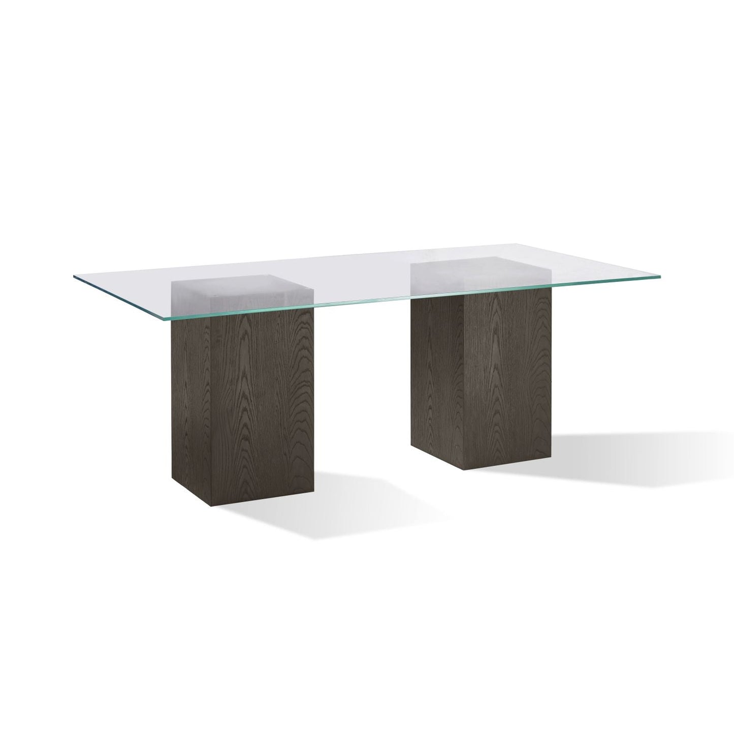 Straightforward confidence. The Modesto dining collection's crisp, modern appeal comes from the clever interplay of its glass, concrete and pull-through pedestal base. Wire brushed White Oak veneer is capped with Ash end grain and pulled through each table and bench top for handsome contrast and a striking finish.
