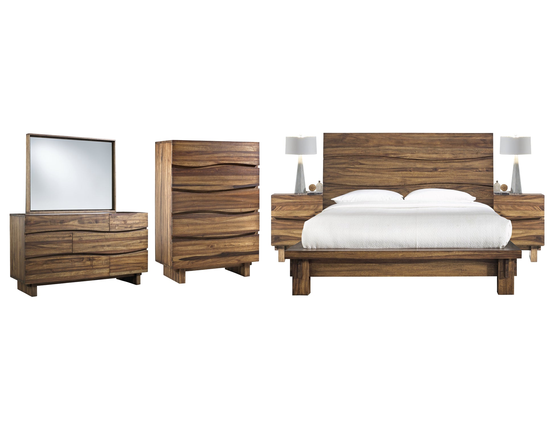 The Modus Ocean 6PC E King Platform Bed Dresser Mirror Two Nightstand Chest Bedroom Set In Natural Sengon. Inspired by modern California beach-chic, the Ocean collection is crafted from solid Sengon Tekik wood in a vibrant natural finish. Distinctive wave fronts provide the perfect canvas for hidden drawer pulls, which maintain the group?s clean profile. Breathe fresh air into your bedroom with Ocean.
