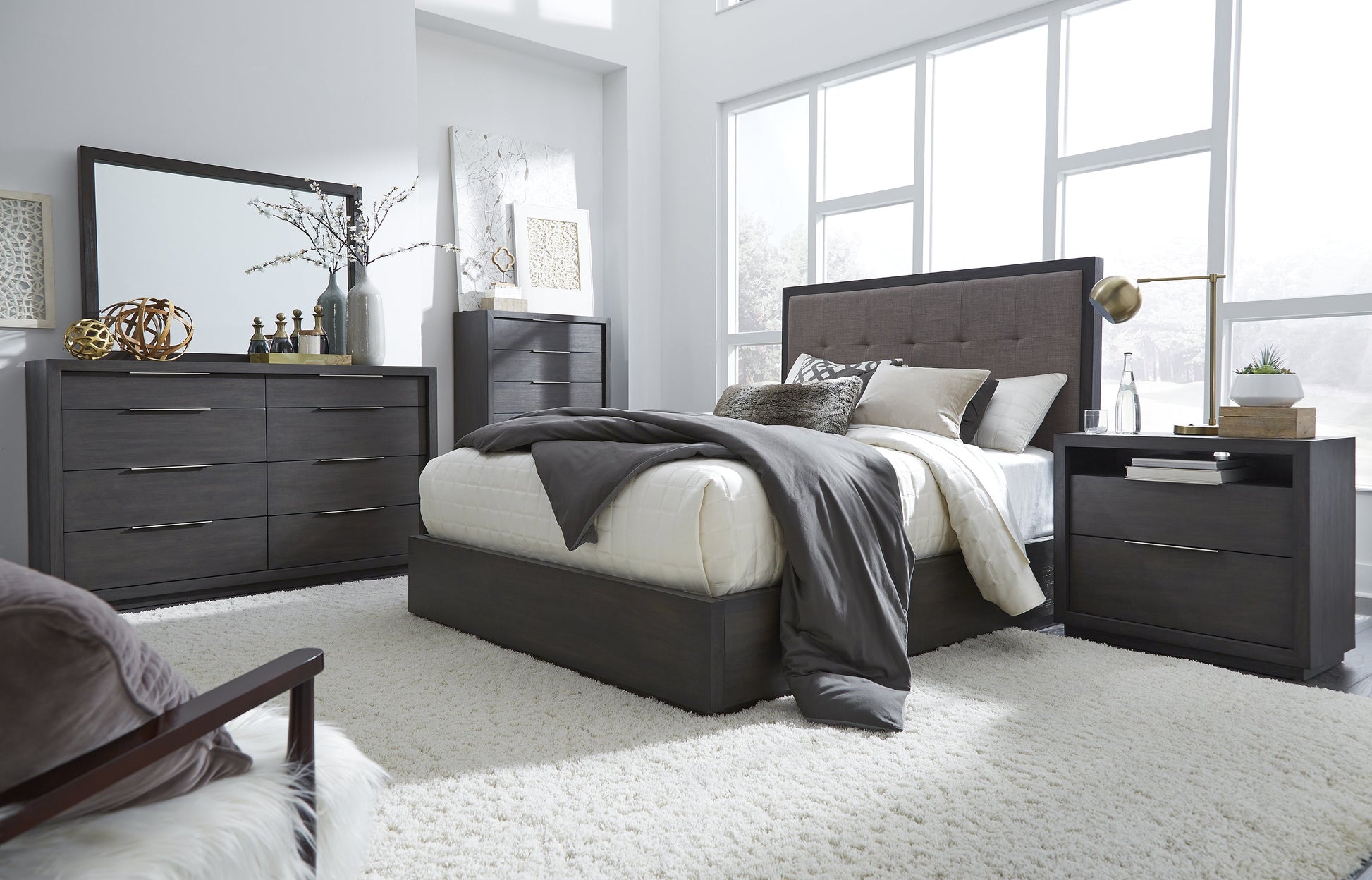 The Modus Oxford 6PC Cal King Storage Bed Dresser Mirror Two Nightstand Chest Bedroom Set In Dolphin. The sleekly tailored Oxford collection makes a striking first impression with bold proportions, crisp, modern lines and a weathered finish. Smartly accented with top-mounted nickel plated pulls, concealed footboard storage, and a floating plinth base. Available in Basalt Grey. Solid Acacia with Acacia veneer Mitered top and side panels Wire brushing enhances natural grain patterns Sanded and stained solid wood drawer boxes with full-extension ball bearing glides and English dovetail joinery.