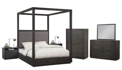 The Modus Oxford 6PC E King Canopy Bed Dresser Mirror Two Nightstand Chest Bedroom Set In Dolphin. The sleekly tailored Oxford collection makes a striking first impression with bold proportions, crisp, modern lines and a weathered finish. Smartly accented with top-mounted nickel plated pulls, concealed footboard storage, and a floating plinth base. Available in Basalt Grey. Solid Acacia with Acacia veneer Mitered top and side panels Wire brushing enhances natural grain patterns Sanded and stained solid wood drawer boxes with full-extension ball bearing glides and English dovetail joinery.