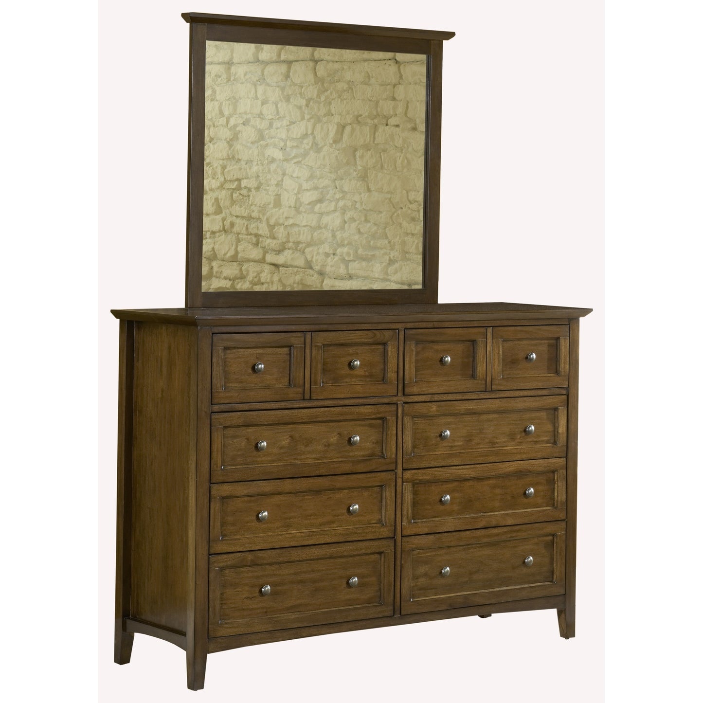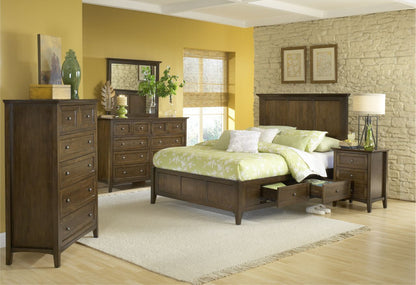 The Modus Paragon 5PC Cal King Storage Bed Dresser Mirror Two Nightstand Bedroom Set In Truffle. Get a fresh take on classic Shaker style with the Paragon bedroom from Modus Furniture. Crafted entirely from solid Mahogany in an opaque black finish, this group features a simple, framed panel design with reverse bevel floating tops. Casegoods rest atop tapered legs with a gently arched lower side cross.