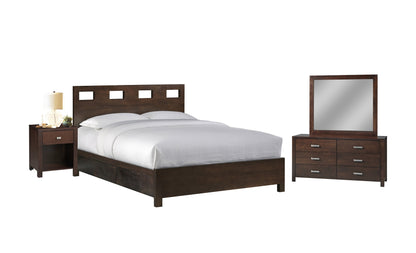 The Modus Riva 4PC Cal King Storage Bed Dresser Mirror One Nightstand Bedroom Set In Chocolate Brown. The Riva bedroom collection offers styling and design that will add a sleek modern look to your bedroom. This collection is crafted from Tropical Mahogany solid wood and Birch wood veneer in a chocolate brown finish with highlights ranging in hue from yellow to burgundy.