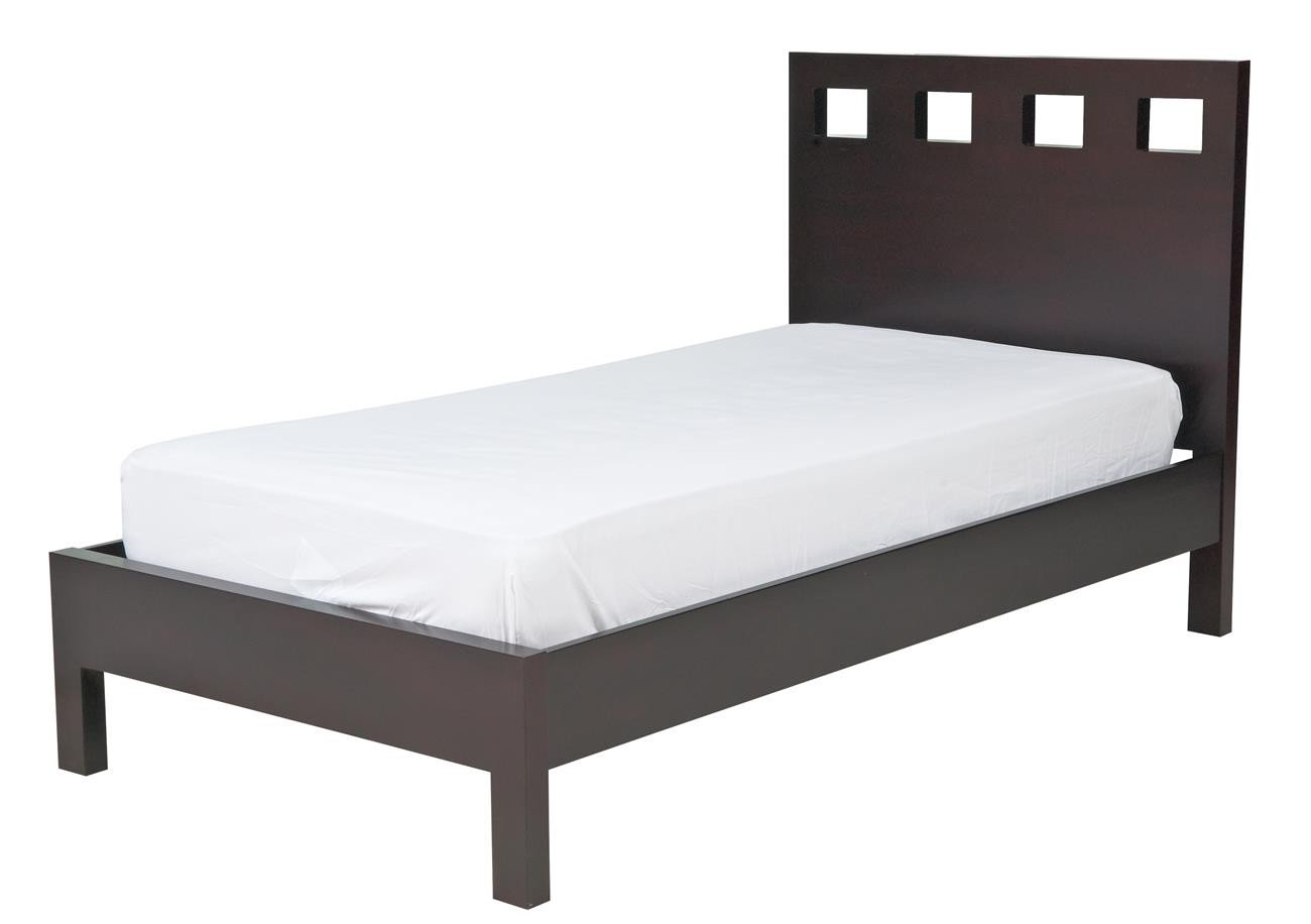 An artful, bold rectangular cut-out headboard brings a distinctive unique flair to the sleek, yet practical frame. A very eclectic choice for a striking piece of affordable statement furniture.
