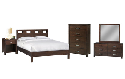 The Modus Riva 5PC E King Platform Bed Dresser Mirror One Nightstand Chest Bedroom Set In Chocolate Brown. The Riva bedroom collection offers styling and design that will add a sleek modern look to your bedroom. This collection is crafted from Tropical Mahogany solid wood and Birch wood veneer in a chocolate brown finish with highlights ranging in hue from yellow to burgundy.