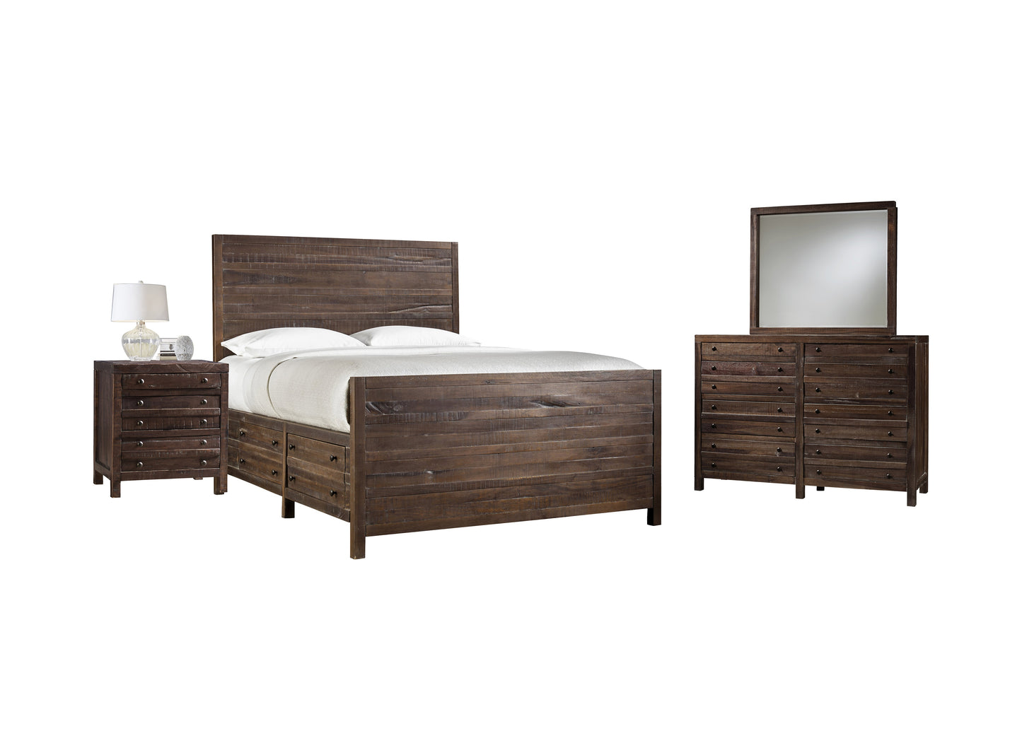 The Modus Townsend 4PC Cal King Storage Bed Dresser Mirror One Nightstand Bedroom Set In Java. The rough and tumble Townsend collection is crafted from solid hardwood, featuring naturally roughhewn planks with heavy saw marks, pitting and wane. A 9-step finish uses glaze to highlight wood grain and a light wash to simulate the patina of age. Shallow top drawers are perfect for storing delicate items with the map drawer effect repeated with faux parting rails on large lower drawers.
